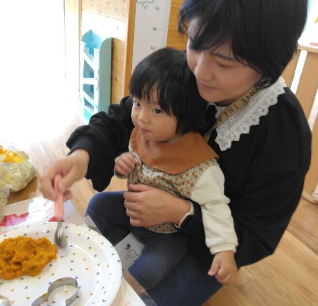 0歳児クラスでは、蒸かしたさつまいもとかぼちゃのクッキング✨