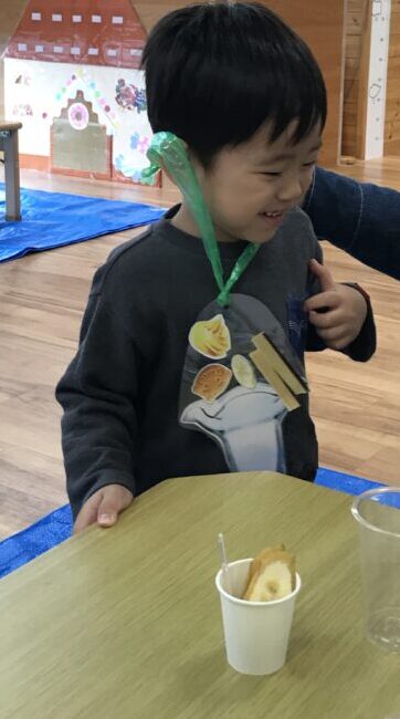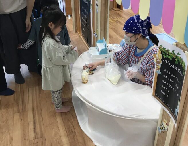 アイス屋さんではミルクアイスをのせてもらい、最後にコックさんになった子どものピックをさして完成(o^―^o)