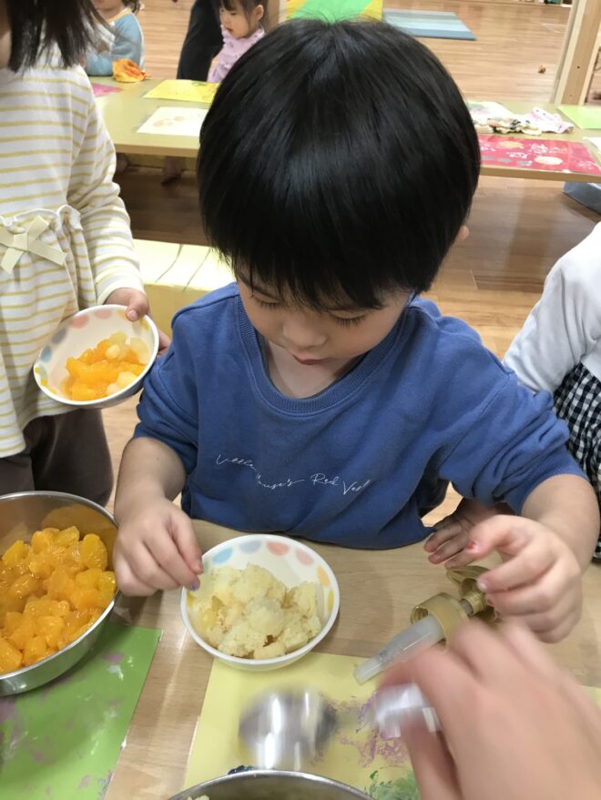 おやつにはクリスマスケーキづくりをしました。目の前にケーキの材料が登場すると、子どもたちの目はキラキラ✨「何をのせようかなぁ」とワクワクしながら、先生の前に集まりました。